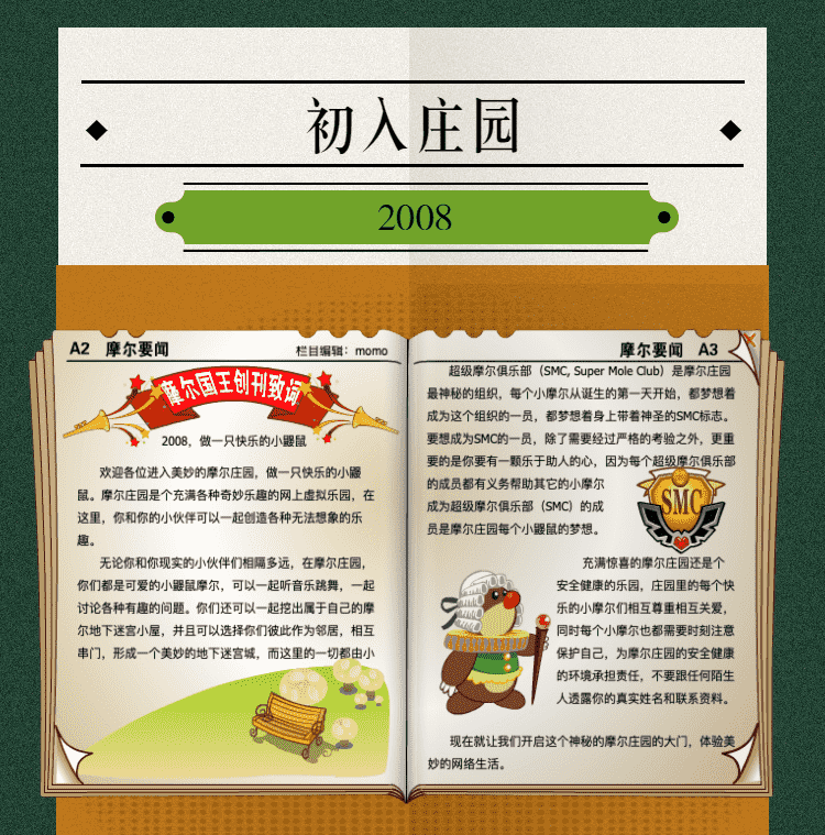 在这一年,,摩尔庄园诞生了。。在这里,,,大家都是可爱的红鼻子鼹鼠小摩尔,,,,可以一起勤劳耕作,,,,一起高山滑雪......我们都是摩尔庄园的建设者。。。。
